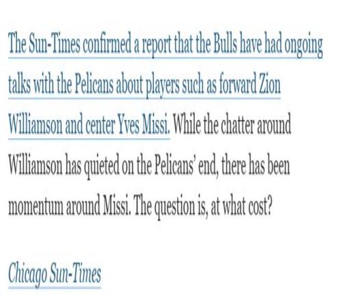 想要促成交易,鵜鶘隊必須抱著擺爛的心態(tài),將錫安與米西打包,換取公牛隊一批合同即將到期的球員,例如中鋒尼古拉-武切維奇、后衛(wèi)科比-懷特以及前鋒杰倫-史密斯。