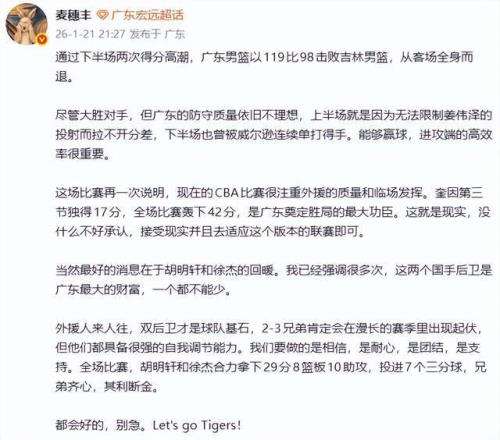 盡管贏了,但是,就這場比賽來看,兩隊(duì)真的是不設(shè)防,只顧在進(jìn)攻端沖擊,卻絲毫不在意防守。因此,當(dāng)廣東隊(duì)客場以119-98大勝吉林隊(duì)之后,廣東媒體人麥穗豐老師就忍不住了,公開怒批廣東隊(duì)。