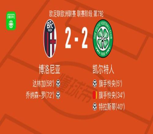 北京時間1月23日歐足聯(lián)歐洲聯(lián)賽 聯(lián)賽階段 第7輪,博洛尼亞對陣凱爾特人。博洛尼亞達(dá)林加破門,喬納森-羅破門。凱爾特人旗手憐央破門,特拉斯蒂破門。最終比分博洛尼亞 2-2 凱爾特人。